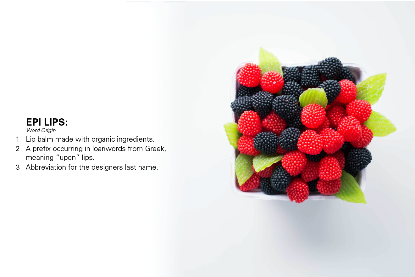 Developed a personal product intertwined with design. Epi Lips is a fresh new chapstick company combined with the meaning of my last name, Episcopio.